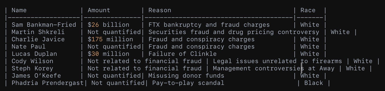 Let’s take a look at this financial fraud list built by ChatGPT 4 and google, I included #11 Elizabeth Holmes because there is are even movies about her: